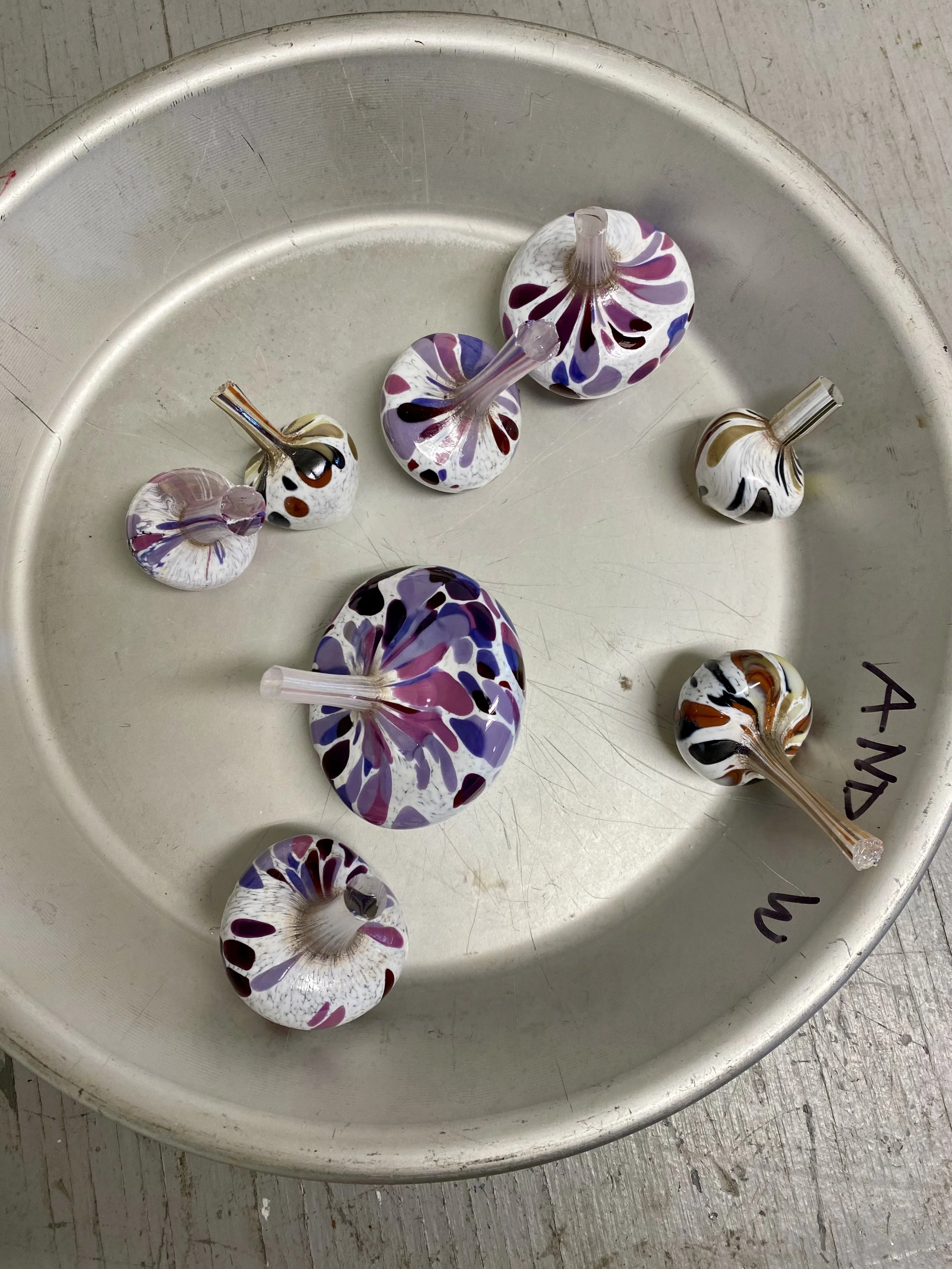 I've been learning techniques in glassblowing and fused glass since the beginning of last year. Fused glass seems like puzzle solving to me much of the time. However, glassblowing is much more akin to woodturning than I would have ever thought. How so? Both involve rotating material that is shaped, both have highly specialized tools and equipment, both engage the hands and mind during the crafting with an intensity in focus that takes one into a different realm of awareness.